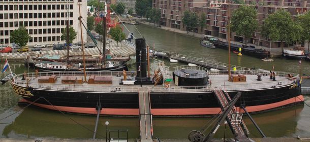 The Buffel, built in Scotland, served in the Royal Dutch Navy from 1868 to 1894 as a ram tower ship to defend Dutch coastal waters. As such, the Buffel was the Navy’s first fully steam-propelled ship. In 1896 the ship was renovated and put into use as a accommodation and training ship for naval personnel. The Buffel served in Hellevoetsluis until 1920, after which the ship had many home ports such as Vlissingen, Den Helder and Amsterdam. In 1974, the Royal Navy transferred the ship to the municipality of Rotterdam. The ship was then beautifully restored and furnished and was part of the Maritime Museum as a museum ship until 2013. In 1995 the ship received the prestigious Maritime Heritage Award from the World Ship Trust.